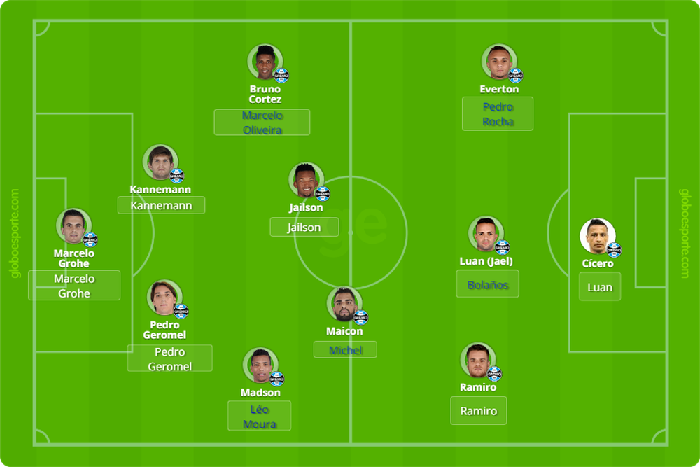 Em branco, provável Grêmio deste domingo; em azul, as mudanças em relação a 2017 (Foto: Infoesporte)