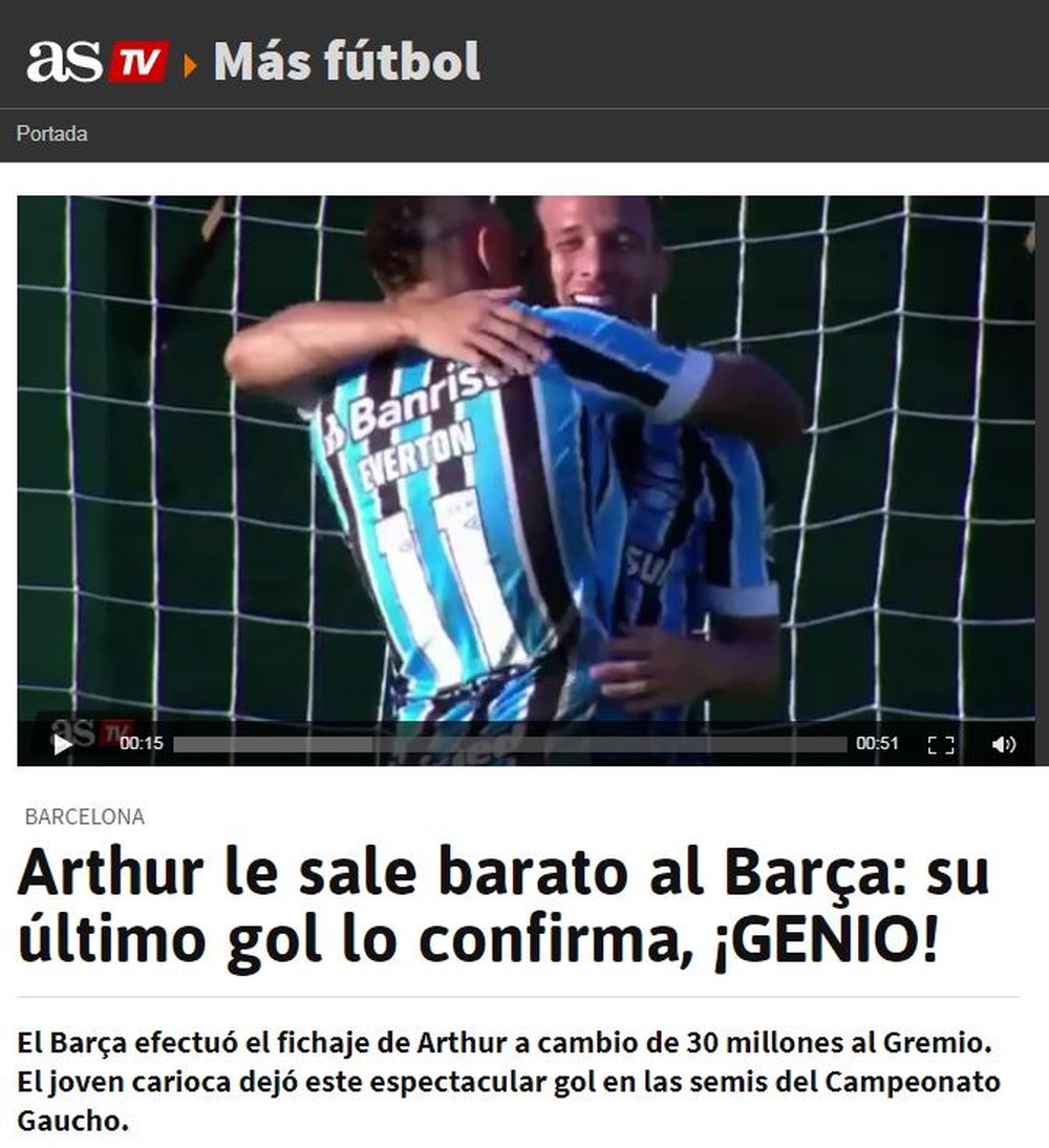 A manchete em questão foi a utilizada pelo As, que destacou: "Arthur sai barato ao Barcelona: seu último gol confirma isso. Gênio!". O gol, que teve direito a um belo drible curto contra os defensores do time de Santa Cruz do Sul, foi ainda chamado de "espetacular" pelo As TV.