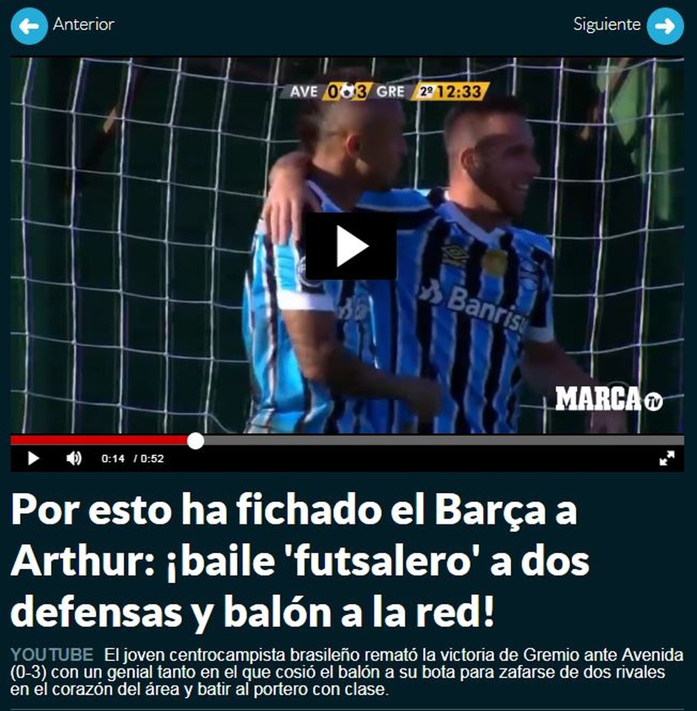 Assim como foi no Gre-Nal da Arena, o volante Arthur faz um gol, o Grêmio vence por 3 a 0 e a imprensa espanhola se deleita com o jogador que vestirá, muito provavelmente, a camisa do Barcelona a partir de janeiro do ano que vem. No último domingo, o camisa 29 fechou a conta da vitória gremista sobre o Avenida, nas semifinais do Gauchão, e o gol foi destaque em três jornais esportivos espanhois. Com direito a elogios superlativos como "gênio".