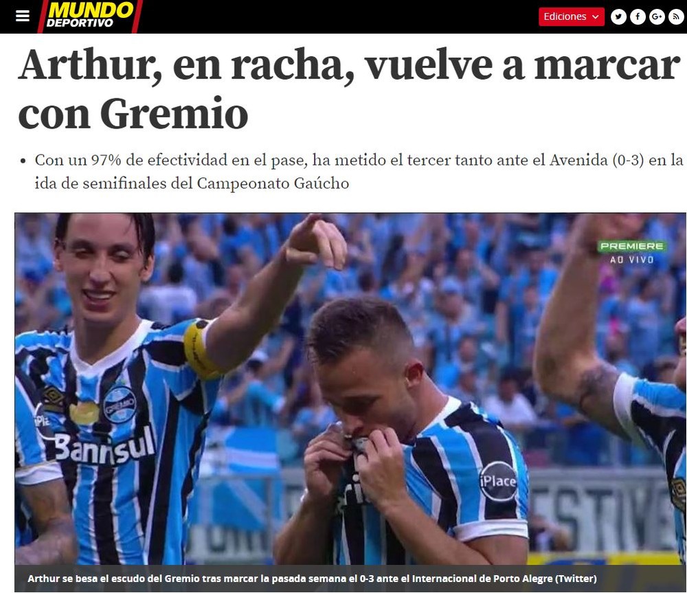 Por fim, o Mundo Deportivo estampou ainda a estatística do ótimo percentual de acerto de passes do volante no jogo contra o Avenida. "Com uma efetividade de 97% no passe, ele fez o terceiro gol na ida das semifinais", fala o jornal. Na matéria, assinada por Sergi Solé, Arthur recebe ainda destaque por, com seus gols e boas atuações, seguir com chances de ser convocado para a Copa do Mundo da Rússia. Além disso, o Mundo Deportivo fala sobre o fato de o jogador ter acertado 99 passes, cinco deles lançamentos longos, durante a partida de domingo.