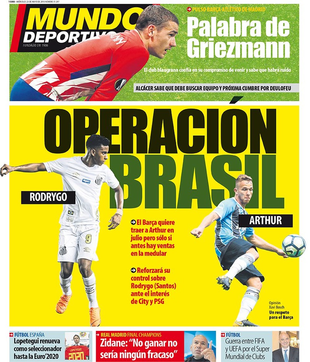 Em solo brasileiro, Pep Segura ainda tratará da contratação de Rodrygo, joia de 17 anos do Santos, com 23 jogos e cinco marcados na temporada. Recentemente, a imprensa catalã noticiou uma eventual desistência dos catalães, devido ao porte físico de Arthur, que mede 1,72m. A notícia, porém, foi minimizada pelo Grêmio e pelo próprio volante.