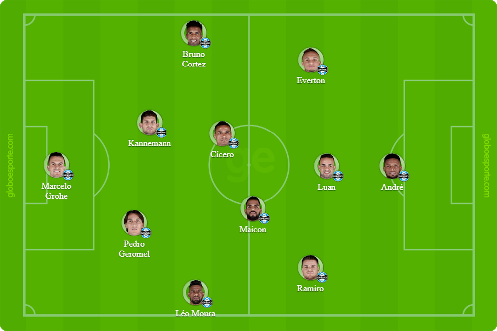 O mais próximo da escalação com força máxima, a partir da volta do Brasileirão, foi colocada em campo contra o Atlético-MG, há 12 dias: Grohe; Léo Moura, Geromel, Bressan e Cortez; Maicon, Cícero, Ramiro, Luan e Everton; André. Kannemann estava afastado, por conta de virose, enquanto o capitão Maicon foi uma surpresa na escalação, por voltar de lesão ainda longe de sua forma ideal.