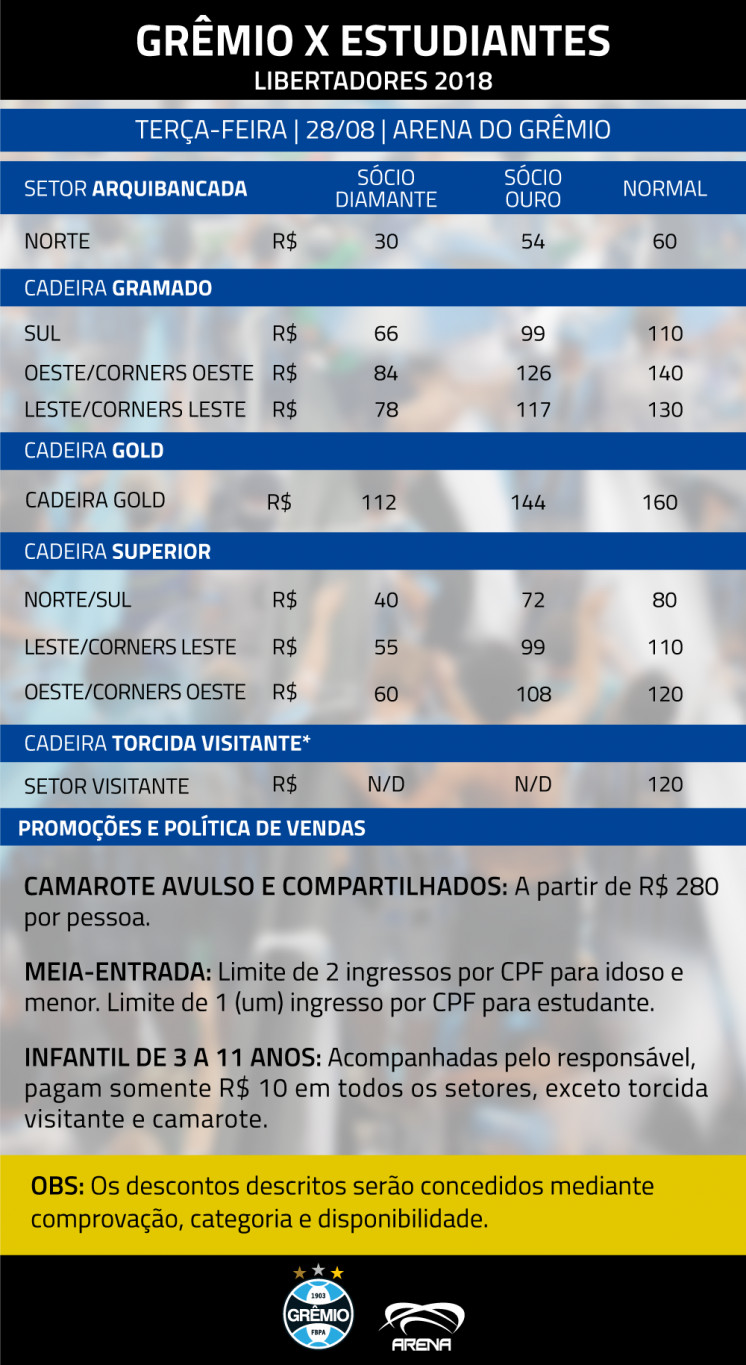 Obs: Portadores do cartão Exército Gremista e CTG (Cadastro do Torcedor Gremista) não têm desconto nem prioridade na aquisição de ingressos.
