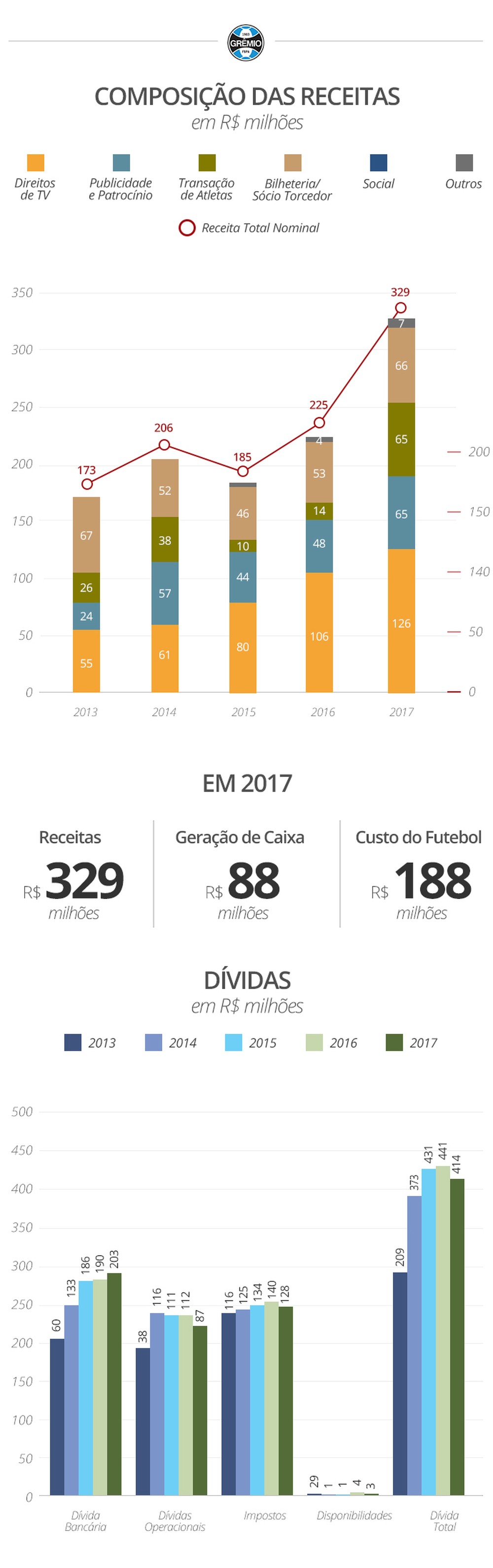 O Grêmio é um dos poucos clubes brasileiros apontados como exemplo de gestão pelo relatório anul do Itaú BBA que analisou as finanças das 27 principais agremiações do futebol brasileiro. O ótimo desempenho em campo, com o título da Libertadores, contribuiu para o clube também alcançar melhor organização financeira. Houve forte crescimento em receitas (46%) na comparação com 2016.