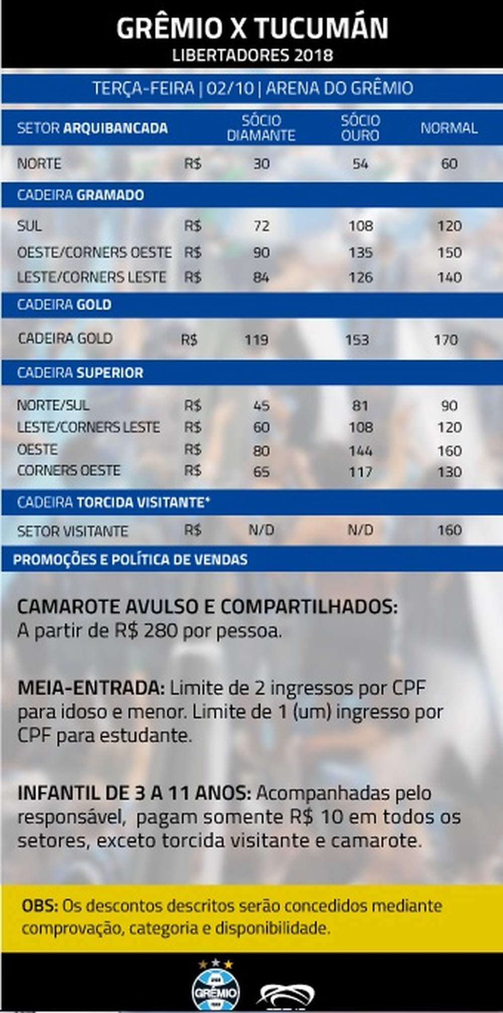 As entrada são comercializadas pelo site www.arenapoa.com.br. Para o torcedor comum, as vendas se iniciam nesta quarta. Os bilhetes saem pelos preços de R$ 60 (R$ 30 para o sócio diamante) a R$ 170. O camarote compartilhado sai pelo preço de R$ 280 por pessoa.
