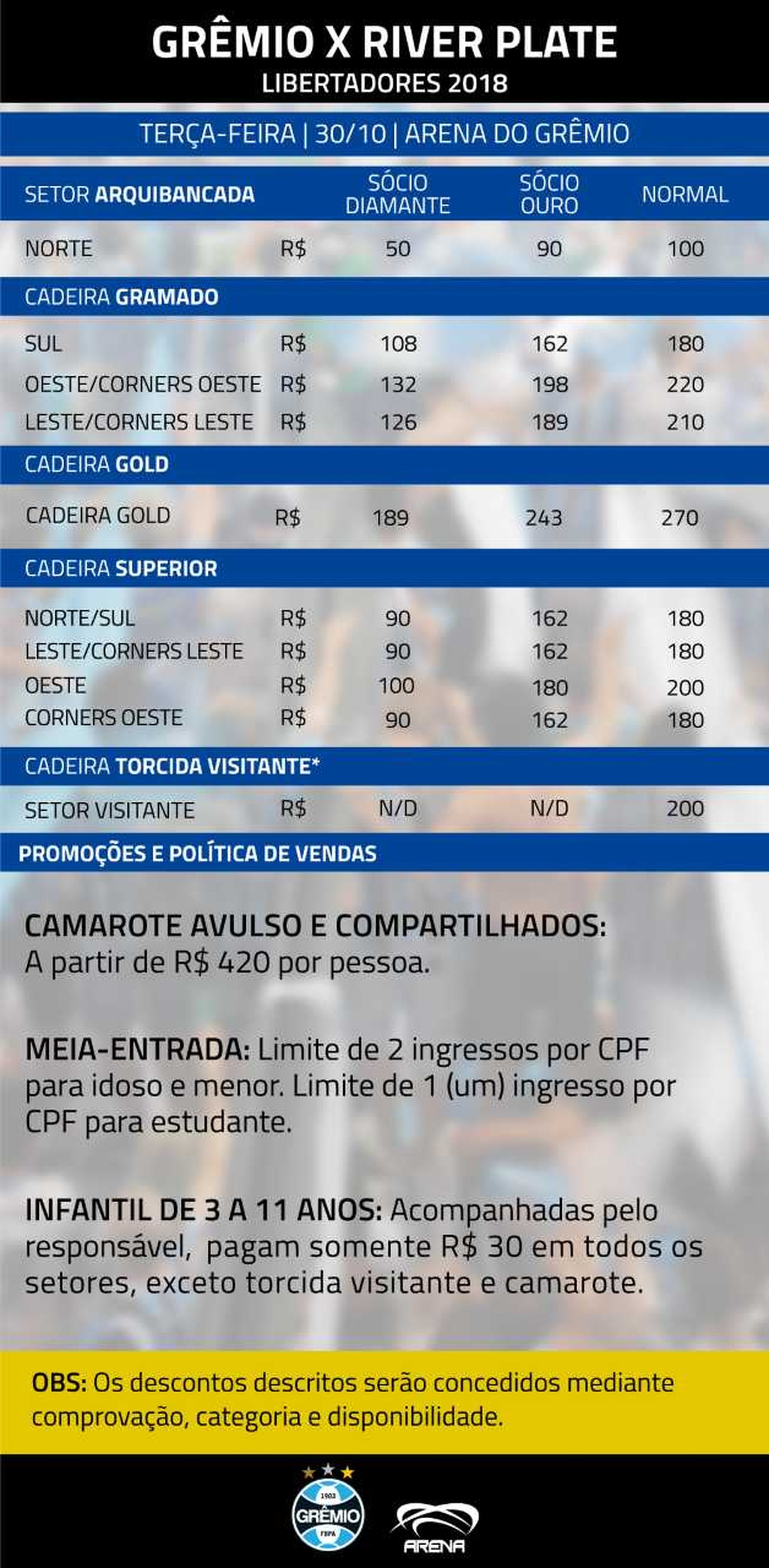 Aos torcedores que planejam ir nas bilheterias e garantirem presença na partida, poderão ir nos dias 28/10 e 29/10, das 11h até às 18h. E os gremistas que quiserem tentar a sorte no dia do jogo, poderão tentar comprar ingressos das 16h45 às 22h30, na Arena.
