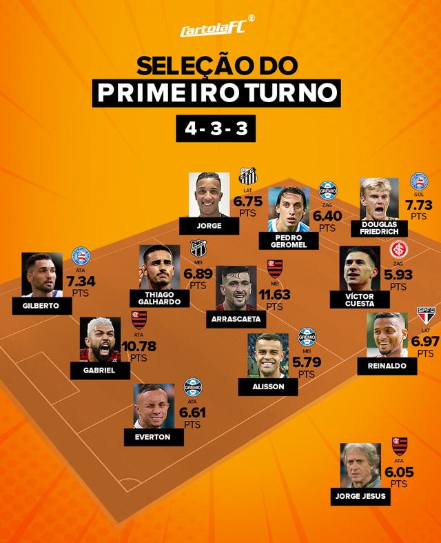 Acabou o primeiro turno do Cartola FC, e depois de muitas mitadas temos a seleção com as melhores médias por posição do fantasy game. Flamengo e Grêmio são os times mais representados, cada um com três nomes. A formação desse supertime considera os jogadores que atuaram em no mínimo 40% das rodadas (oito jogos).