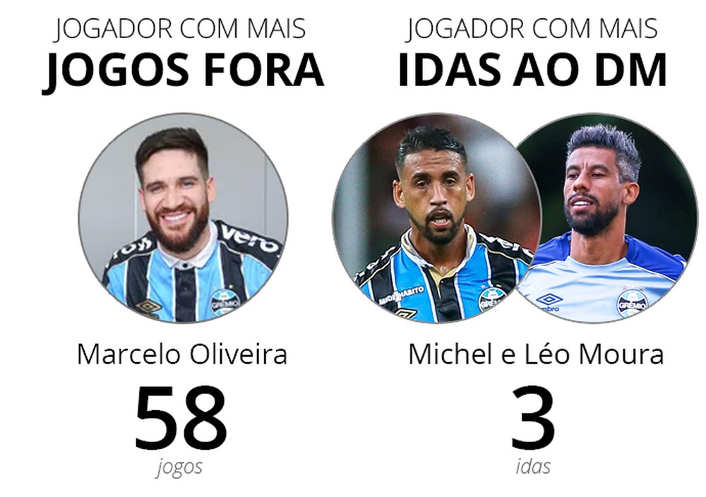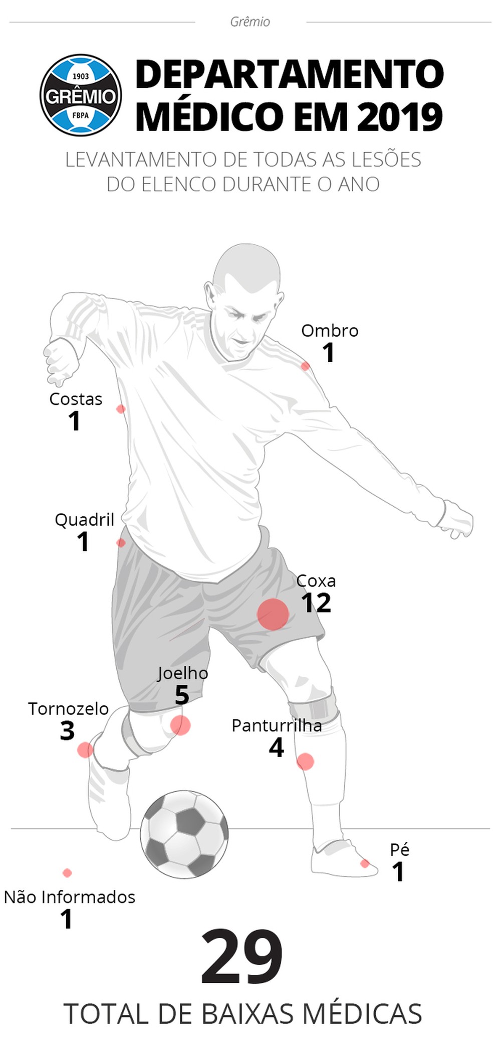 O Grêmio tem motivos tanto para se orgulhar quanto para se preocupar com os números de seus jogadores no departamento médico na temporada 2019. Se a quantidade de problemas médicos despencou de 64 para 29, a gravidade das lesões comprometeu a sequência de muitos. Atletas com status de titular, Luan, Jean Pyerre e Leonardo terminaram o ano no estaleiro. Alisson, Léo Moura, Felipe Vizeu, Michel e Paulo Miranda ficaram longos períodos lesionados, enquanto Marcelo Oliveira foi a grande baixa, com 58 partidas desfalcando o Imortal.