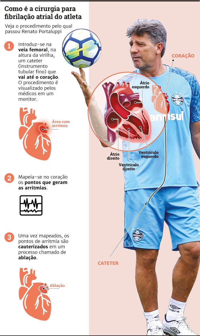 A arritmia do técnico do Grêmio costuma ocorrer com ex-atletas, em razão da carga prolongada de exercícios ao longo da carreira. Com o tempo, a musculatura do coração fica um pouco mais forte e as partes superiores, os átrios, que costumam ser mais delicadas, aumentam e desenvolvem zonas de fibrose, como cicatrizes. Quanto mais delas, mais chance de arritmia.