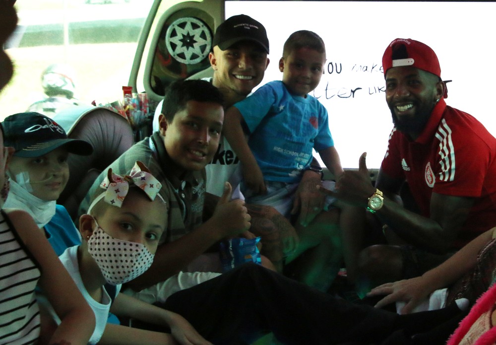 A presença do atacante gremista e do lateral colorado pegou os pequenos de surpresa. Em clima descontraído e de muito carinho, oito crianças assistidas pelo instituto embarcaram em uma limusine com os jogadores para um passeio pelas ruas da capital.