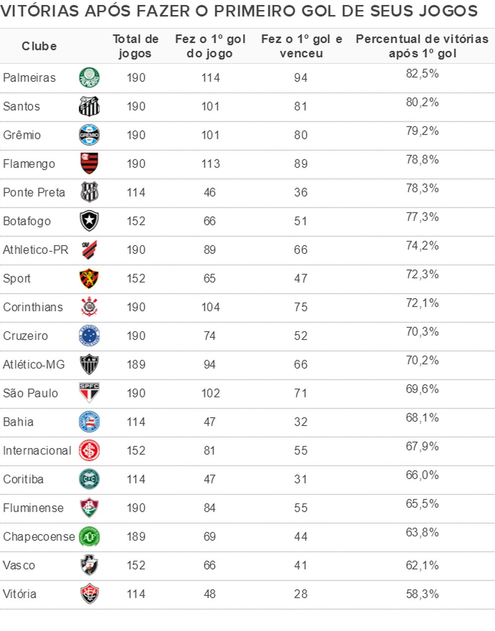 Nos últimos cinco Brasileirões, Palmeiras, Santos, Grêmio e Flamengo foram os times que mais conseguiram sair de campo com uma vitória depois de terem feito o primeiro gol de seus jogos, segundo dados do Espião Estatístico. Suas marcas estão próximas às dos melhores desempenhos das cinco principais ligas europeias nesse quesito.