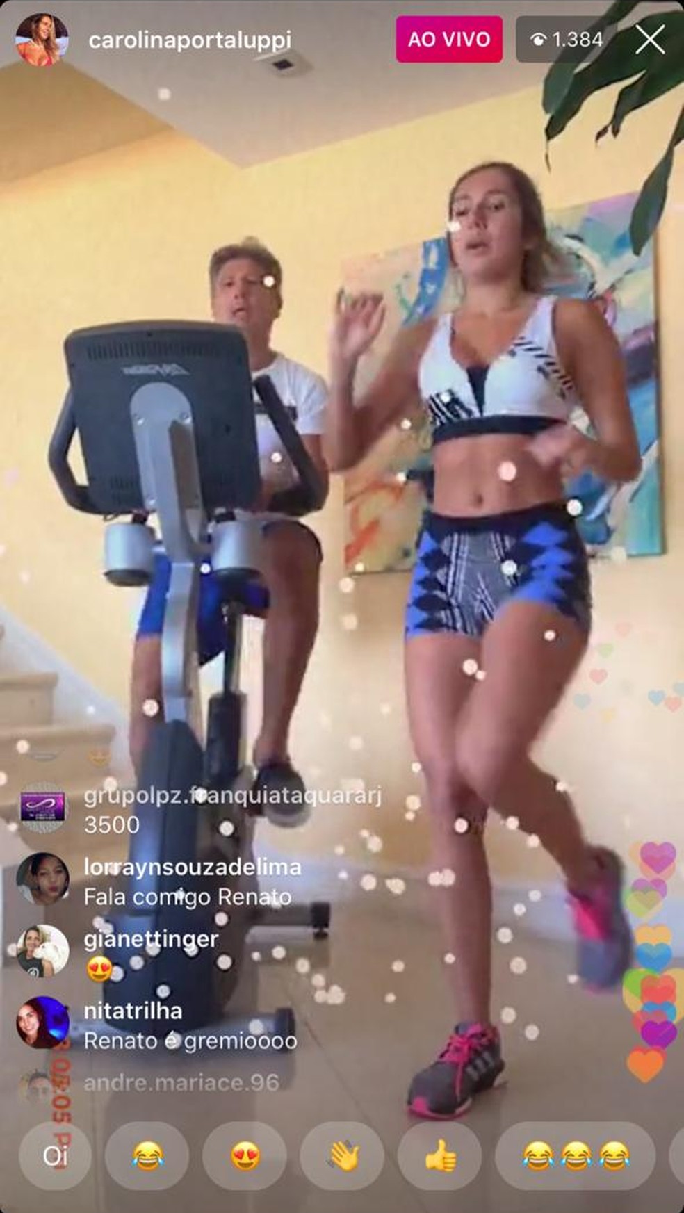 Enquanto Carol fazia um treino funcional e repassava toda a série de atividades aos seus seguidores, Renato pedalava em uma bicicleta ergométrica, sempre entre brincadeiras com a filha. O técnico não retornou a Porto Alegre para a retomada do Tricolor aos treinos por ser considerado do grupo de risco em meio à pandemia do coronavírus.