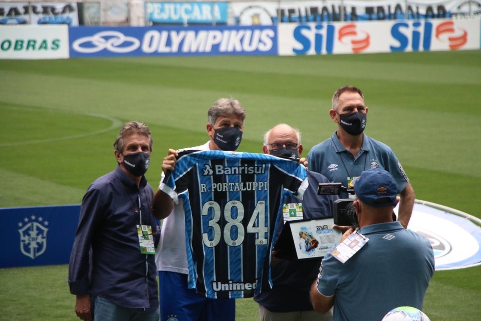 Renato Portaluppi foi homenageado pelo Grêmio nesta segunda-feira antes do jogo contra o Goiás, pela sexta rodada do Brasileirão, ao se tornar o técnico com mais jogos à frente do clube - serão 384 a partir de hoje.