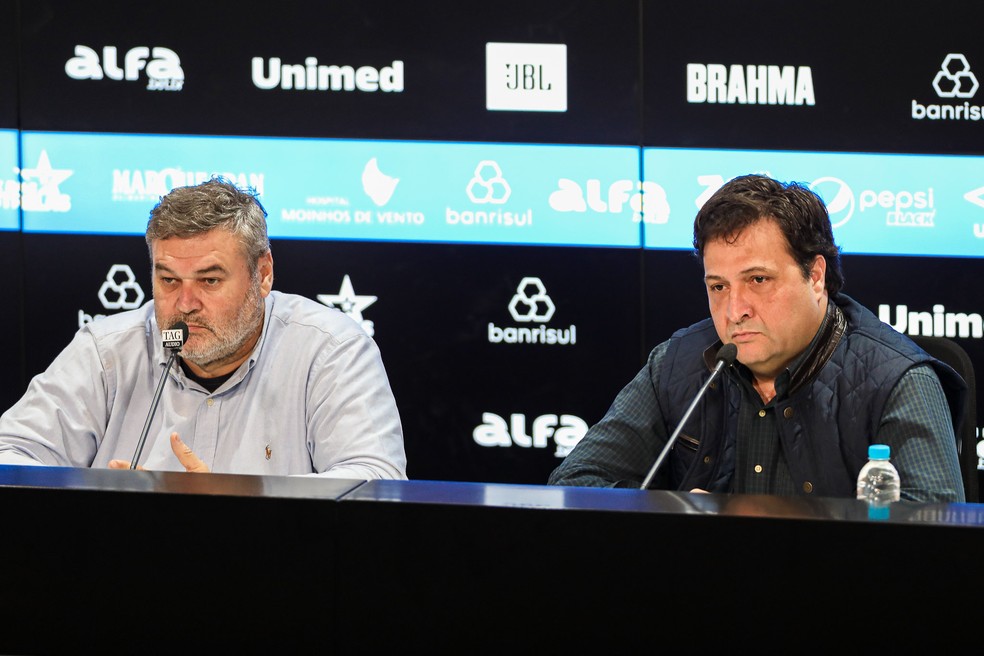 alt="Eduardo Magrisso e Alberto Guerra durante coletiva na Arena do Grêmio">Com a nova administração, o Grêmio também planeja readequar os preços dos ingressos e aprimorar o atendimento aos sócios-torcedores. O objetivo é proporcionar uma melhor experiência para o público e ampliar as receitas do clube, especialmente com os quatro jogos restantes em casa nesta temporada — contra Cruzeiro, Vasco, Palmeiras e Fluminense.