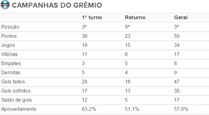 Os números concretizam o saldo negativo dos gremistas no segundo turno. Passadas as 19 rodadas iniciais, o Tricolor detinha a terceira colocação na tabela, com 36 pontos e aproveitamento de 63,2% – campanha igual à do Galo, que levava vantagem no saldo de gols (15 a 12). Nos 15 jogos do returno, porém, o rendimento cai para 51,1%, com 23 pontos, enquanto o Atlético-MG soma 29.