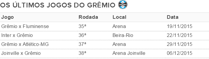 Ainda na luta, o Grêmio terá a terça-feira também de folga. A reapresentação só ocorrerá na quarta. Na próxima rodada, enfrentará o Fluminense. A partida está marcada para o dia 19 de novembro na Arena, às 19h30, pela 35ª rodada do Brasileirão.